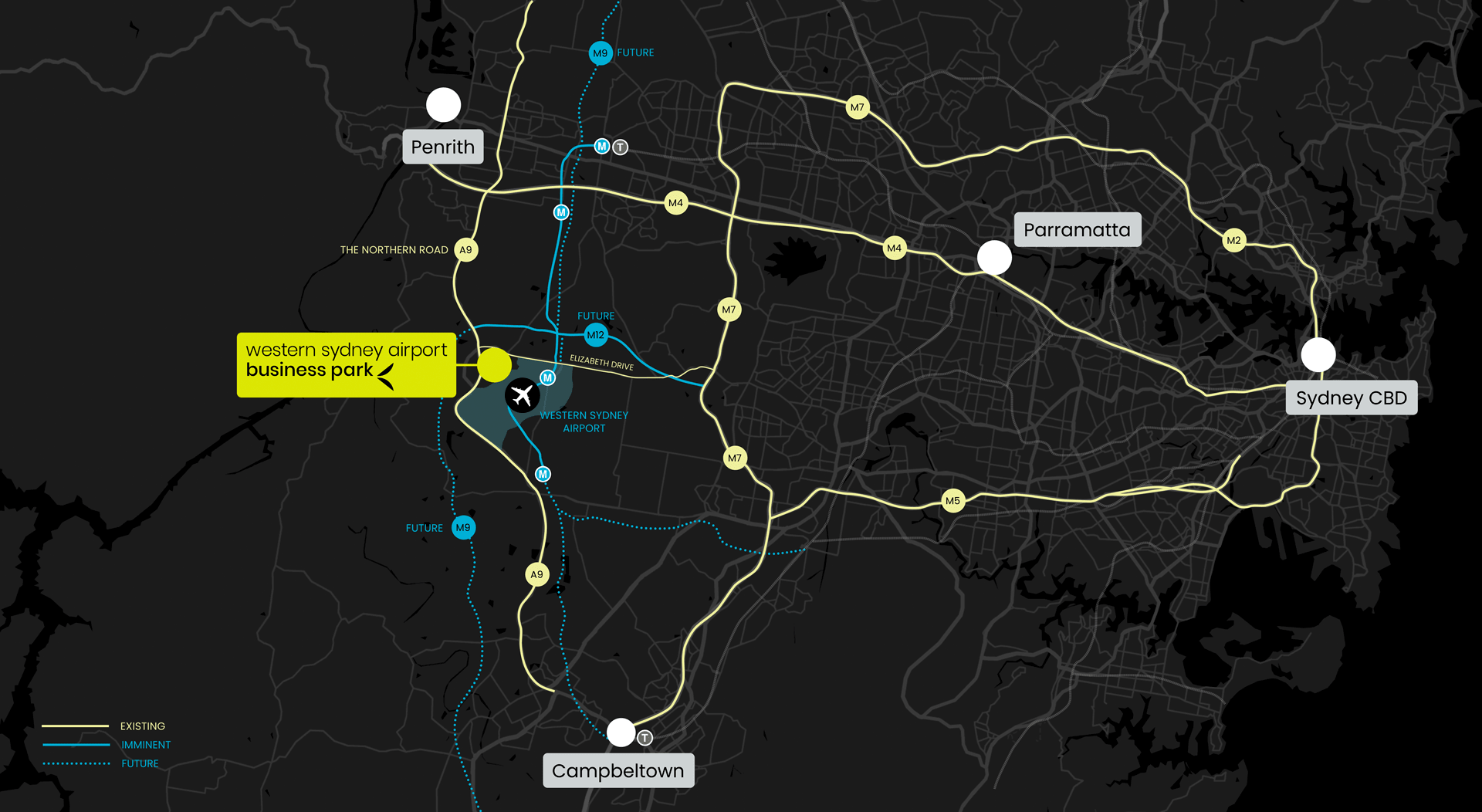 Enjoying a prime position which will overlook the runway, and with over a kilometre of newly completed main road frontage along The Northern Road, opportunities for business and brand exposure are countless.